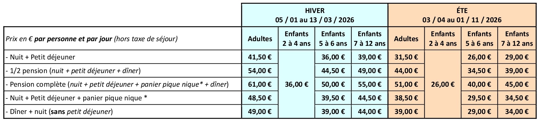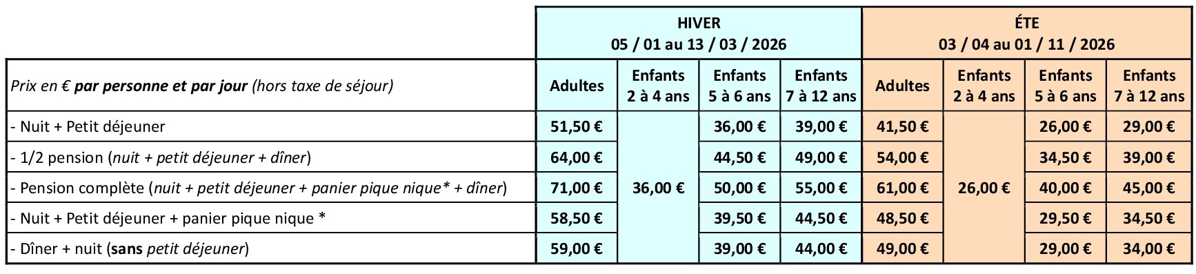 Les prix ci-dessous s’entendent par personne et par jour, hors taxe de séjour (+ 0,80 € par personne et par jour et pour les adultes uniquement).