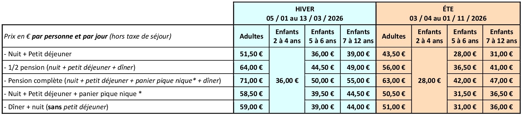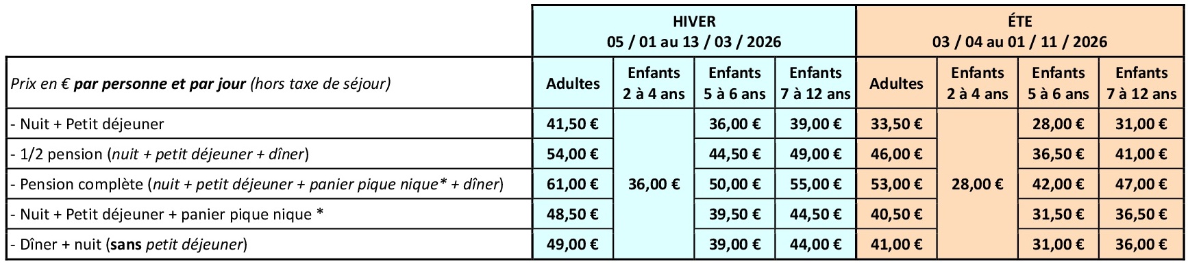 Les prix ci-dessous s’entendent par personne et par jour, hors taxe de séjour (+ 0,80 € par personne et par jour et pour les adultes uniquement).